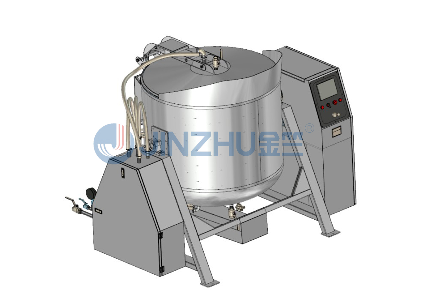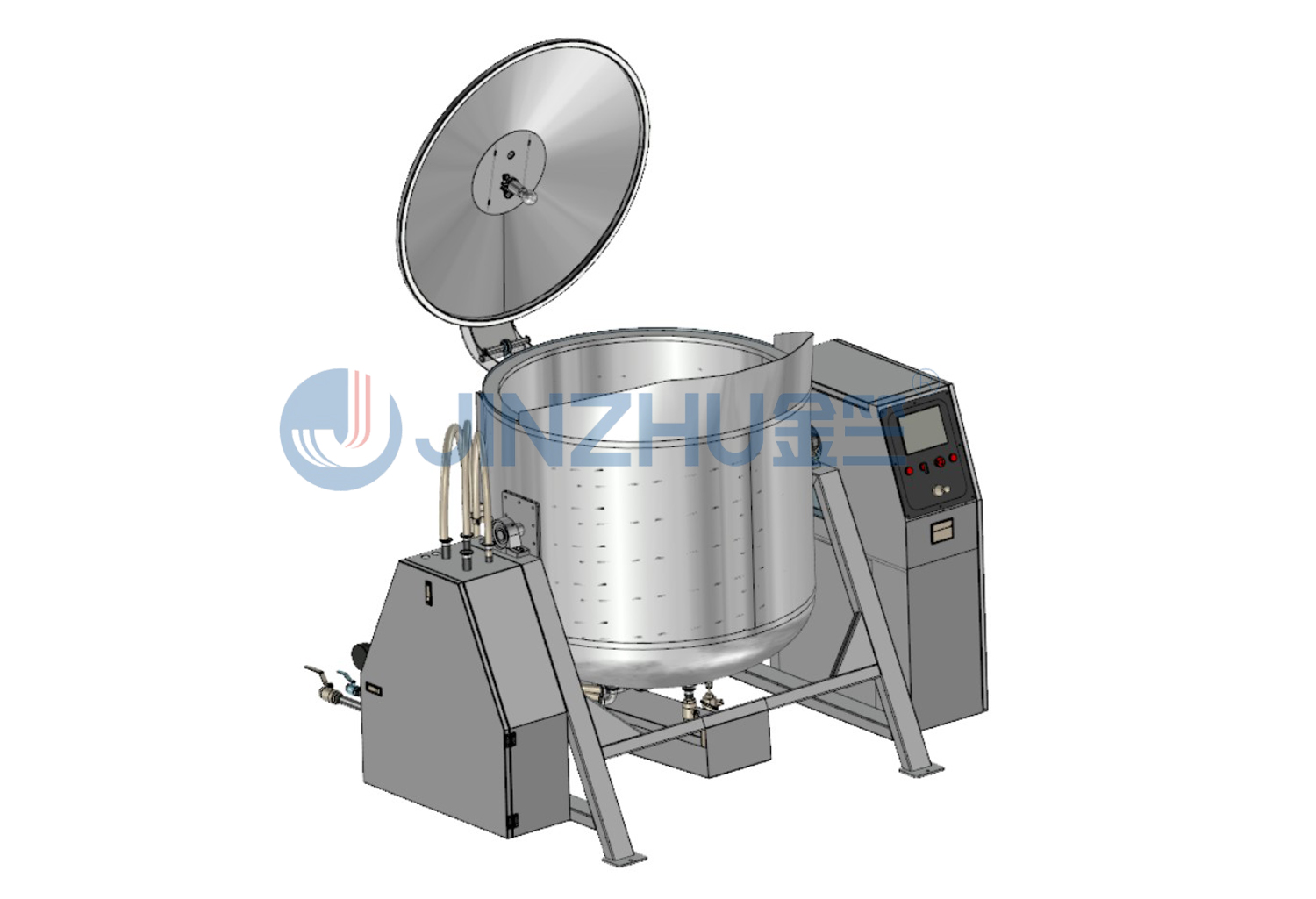 采用气缸开盖,花洒型汽管设计,可根据客户定制设置药液回流装置,锅体夹层内设置蒸汽盘管,加热速度快,底部设置疏水阀,整机设有机械传动装置,自动翻转锅体,方便物料装入和倒出。